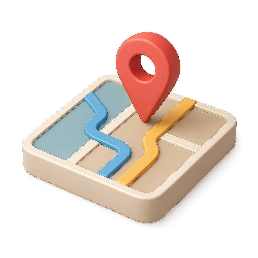 A visually appealing 3D icon representing a navigation app, featuring a map layout with vibrant colors and a prominent location marker, all set against a soft gradient background.
