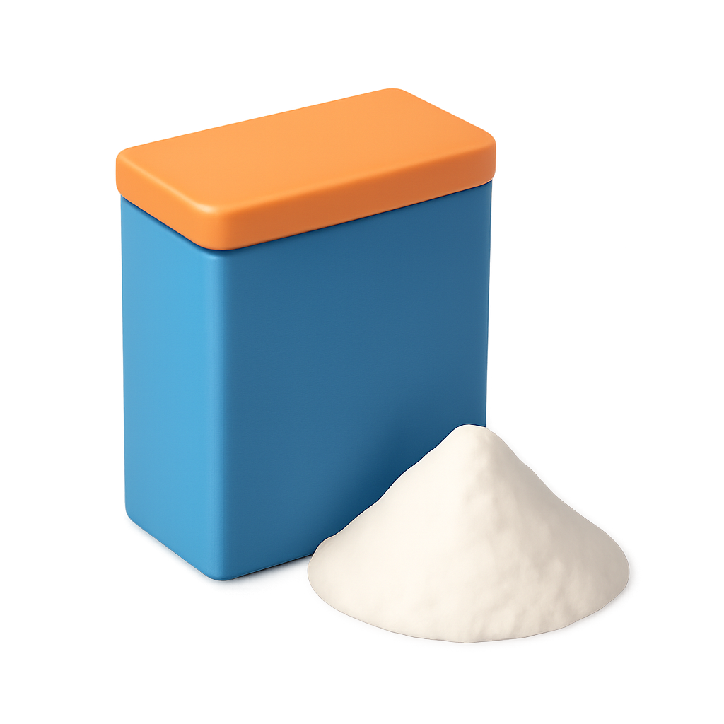 /Collection: /by davooda/Type: PNG/A vibrant 3D icon depicting a blue container with an orange lid next to a mound of white baking soda, showcased in an isometric view with a smooth, volumetric feel.