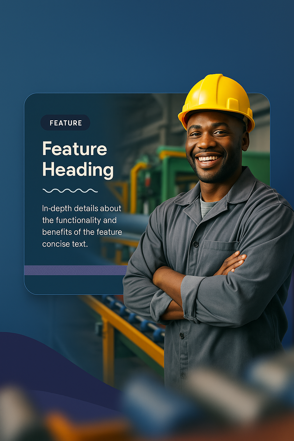 /Collection: /by davooda/Type: PNG/A joyful African American factory worker in a hard hat and work clothes stands confidently next to a production line, showcasing a vibrant workplace atmosphere.