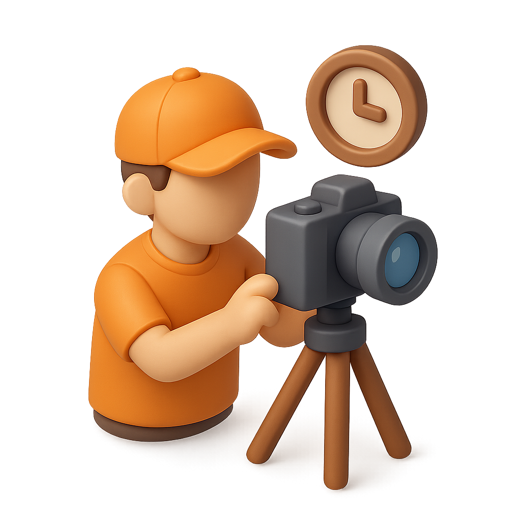 /Collection: /by davooda/Type: PNG/A stylized 3D icon of a photographer in an orange outfit, capturing time-lapse images with a camera on a tripod. The background is transparent, enhancing the 3D effect.