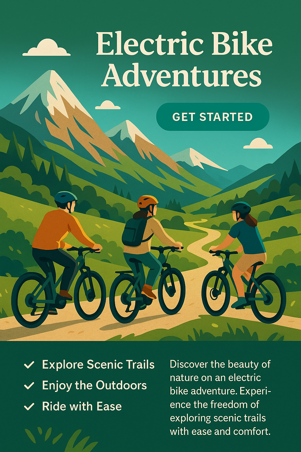 A vibrant promotional graphic for electric bike adventures, featuring scenic mountain trails and cyclists. Ideal for outdoor activity marketing and adventure tourism.