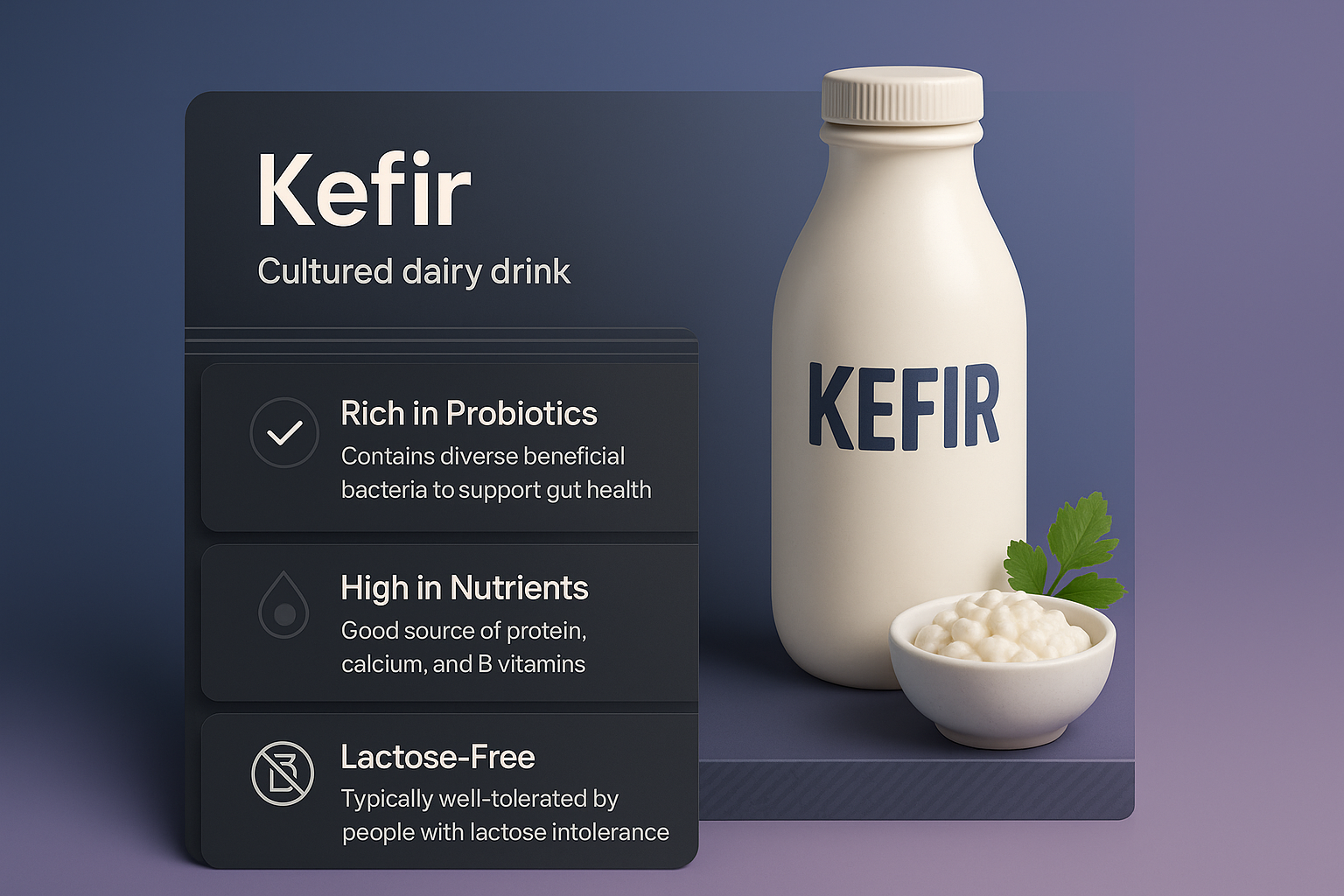 An informative graphic about kefir, highlighting its probiotic content, nutrient richness, and lactose-free nature. Ideal for health enthusiasts.