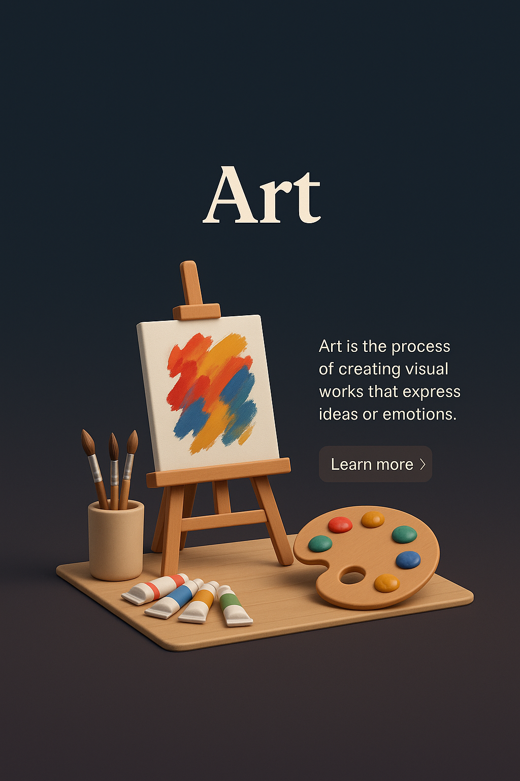 /Collection: /by davooda/Type: PNG/A zoomed-out 3D scene featuring an easel with a colorful painting, a palette, and art supplies on a dark gradient background. The composition highlights the theme of art in a realistic style.