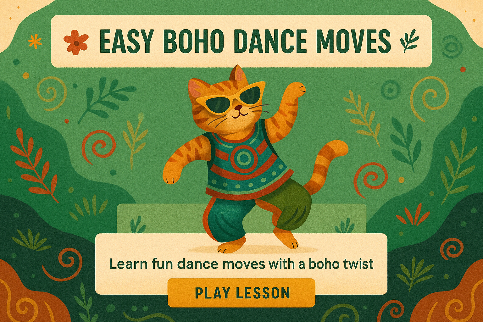 /Collection: /by davooda/Type: PNG/A whimsical illustration of a cat wearing vibrant clothes and sunglasses, joyfully dancing against a green backdrop adorned with floral patterns. The design captures a fun and engaging boho aesthetic.