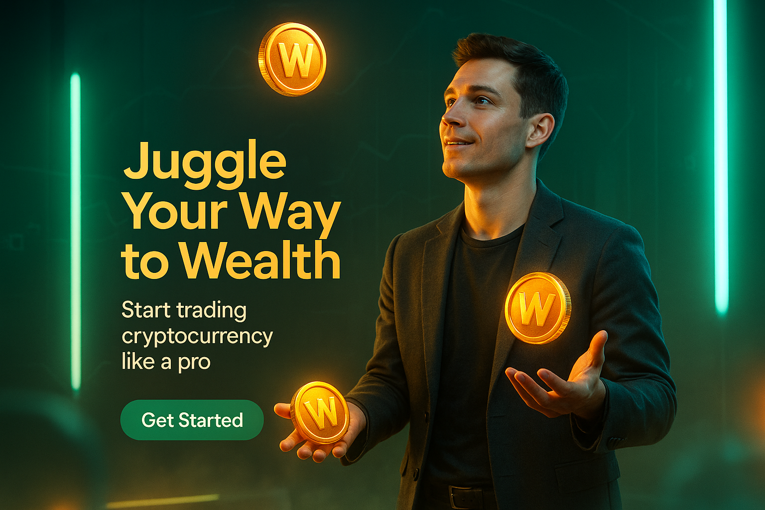 Dynamic promotional graphic showcasing a man juggling cryptocurrency coins, designed to attract users to start trading. The modern style and vibrant colors enhance its appeal for financial enthusiasts.