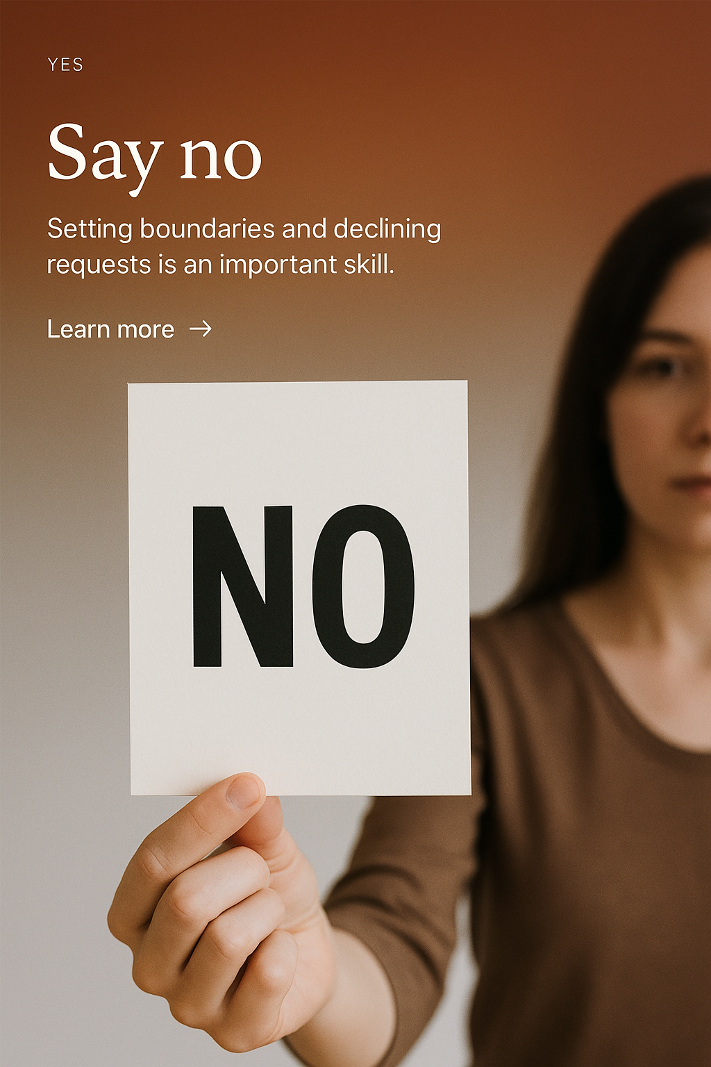 A modern web design featuring a woman holding a sign that says 'NO', emphasizing the importance of setting boundaries. The background transitions from dark to white, ensuring clear readability.