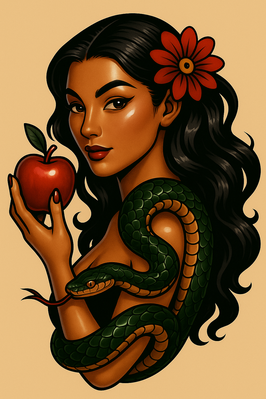 Stylized Woman with Snake and Apple in Tattoo Art Style