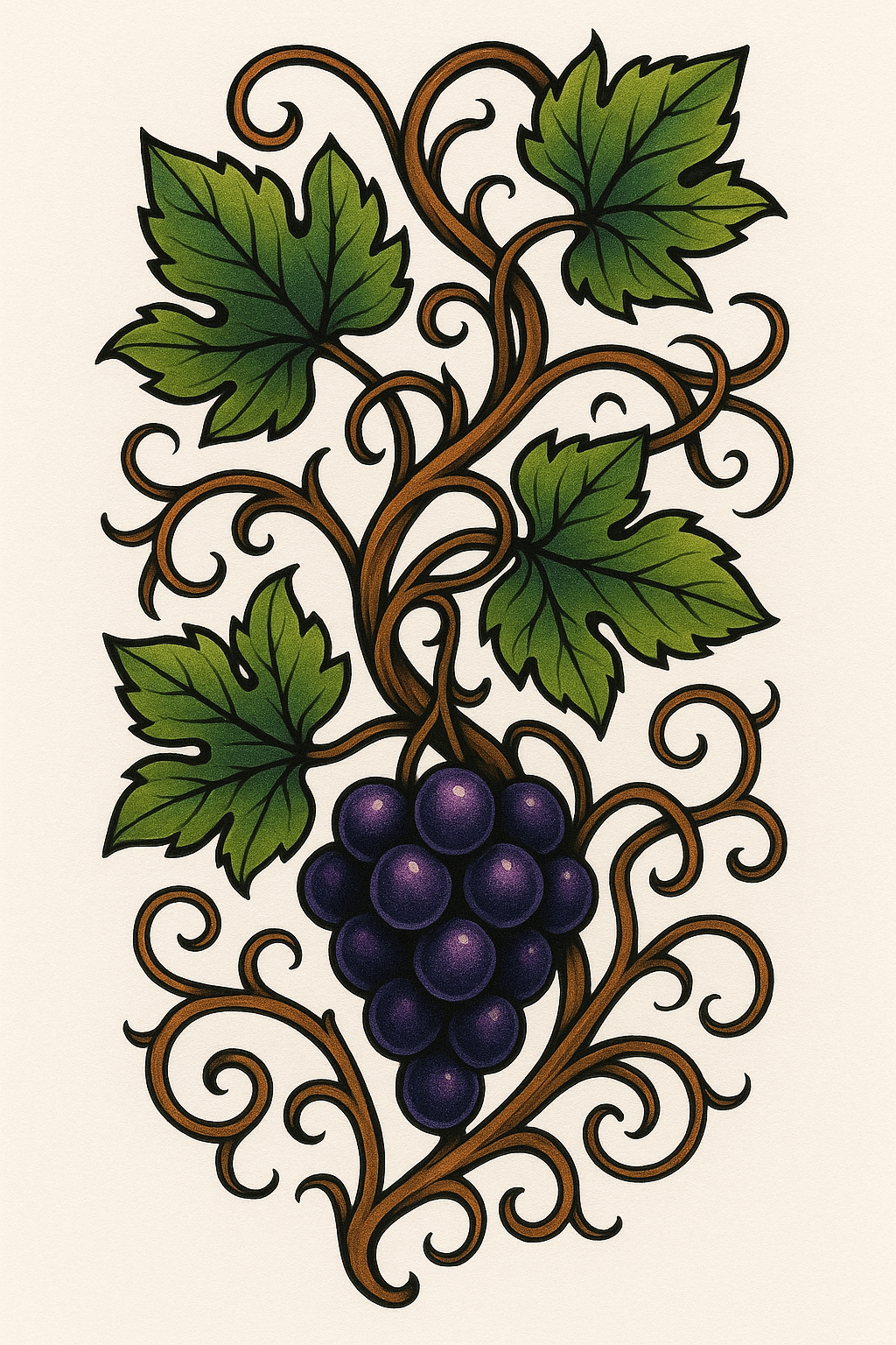 An artistic illustration of a grapevine featuring detailed leaves and clusters of grapes, perfect for wine-related branding or decorative purposes.