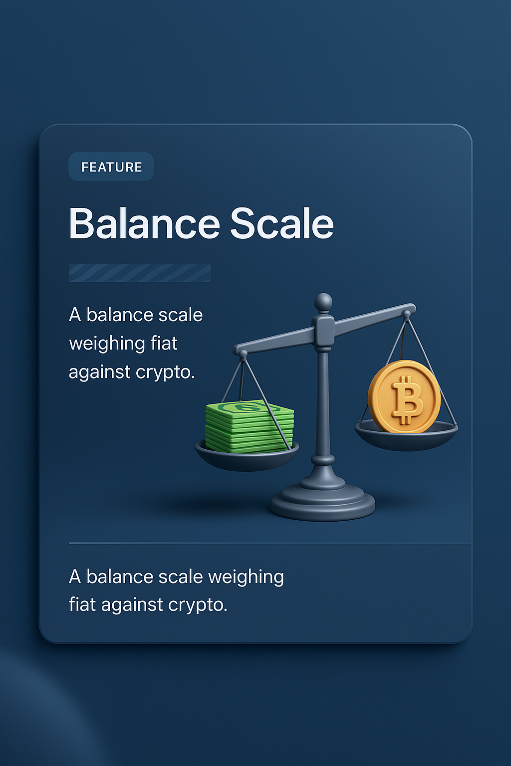 /Collection: /by davooda/Type: PNG/A 3D illustration of a balance scale weighing fiat currency against cryptocurrency. The design features a modern aesthetic with a gradient background and clear labeling.