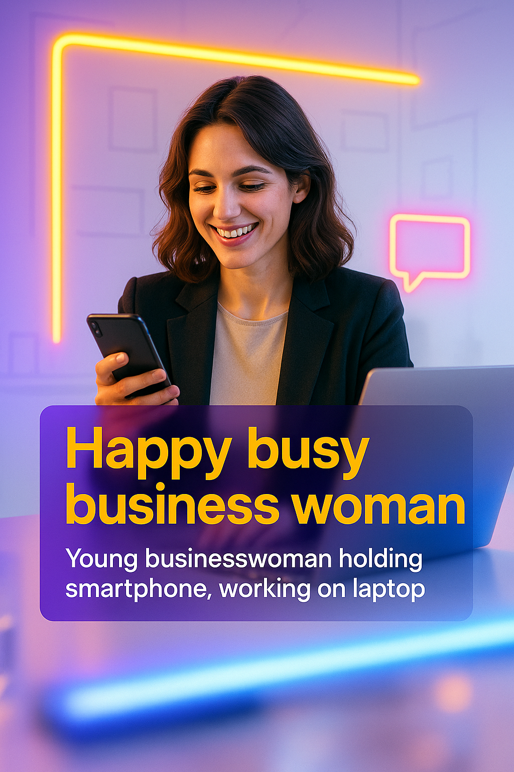 /Collection: /by davooda/Type: PNG/A vibrant image showcasing a young businesswoman smiling while using her smartphone in a stylish workspace, featuring neon lighting. Ideal for professional and tech-related content.