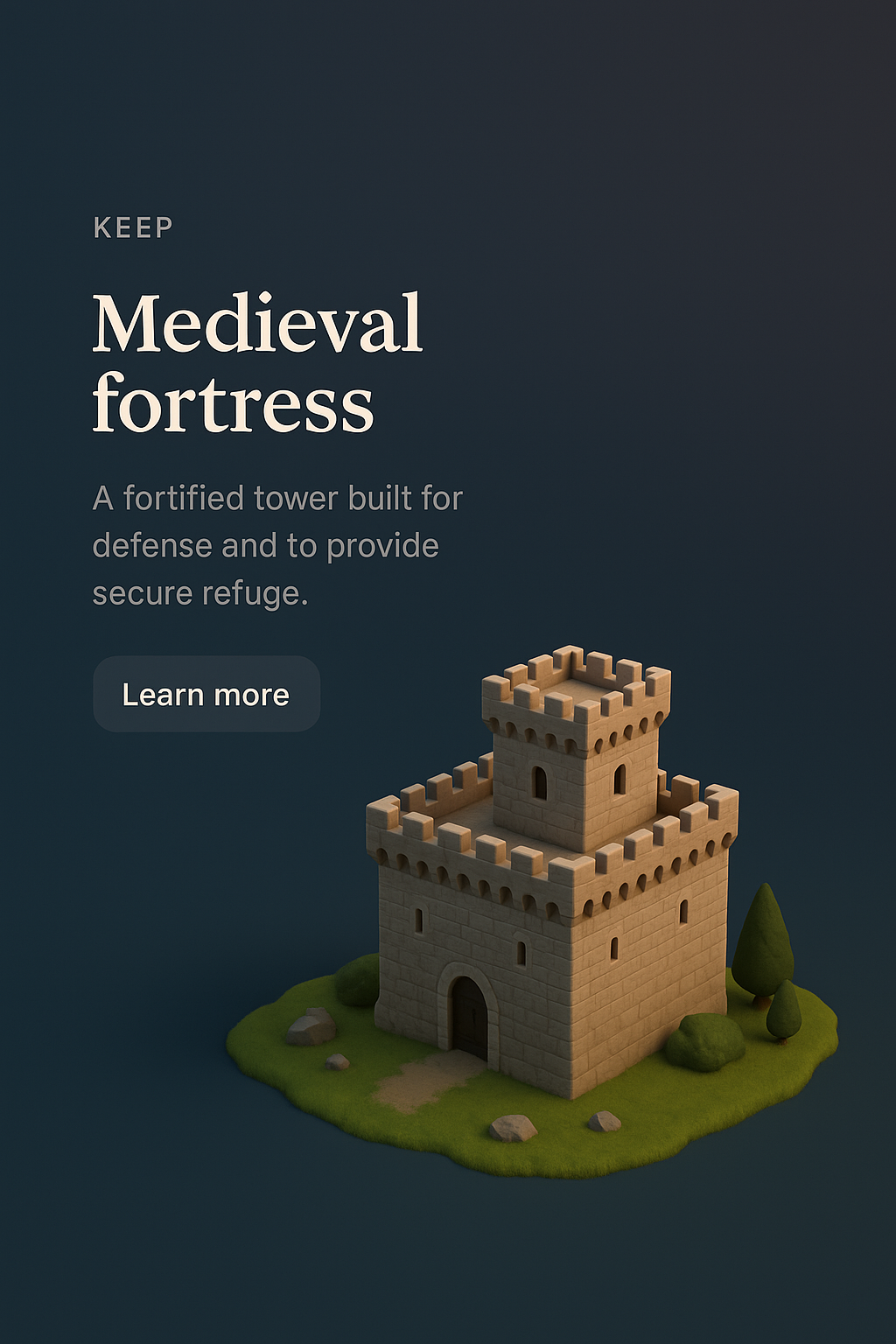 A 3D illustration of a medieval fortress viewed from a distance, showcasing a small castle surrounded by a grassy area, set against a dark gradient background.