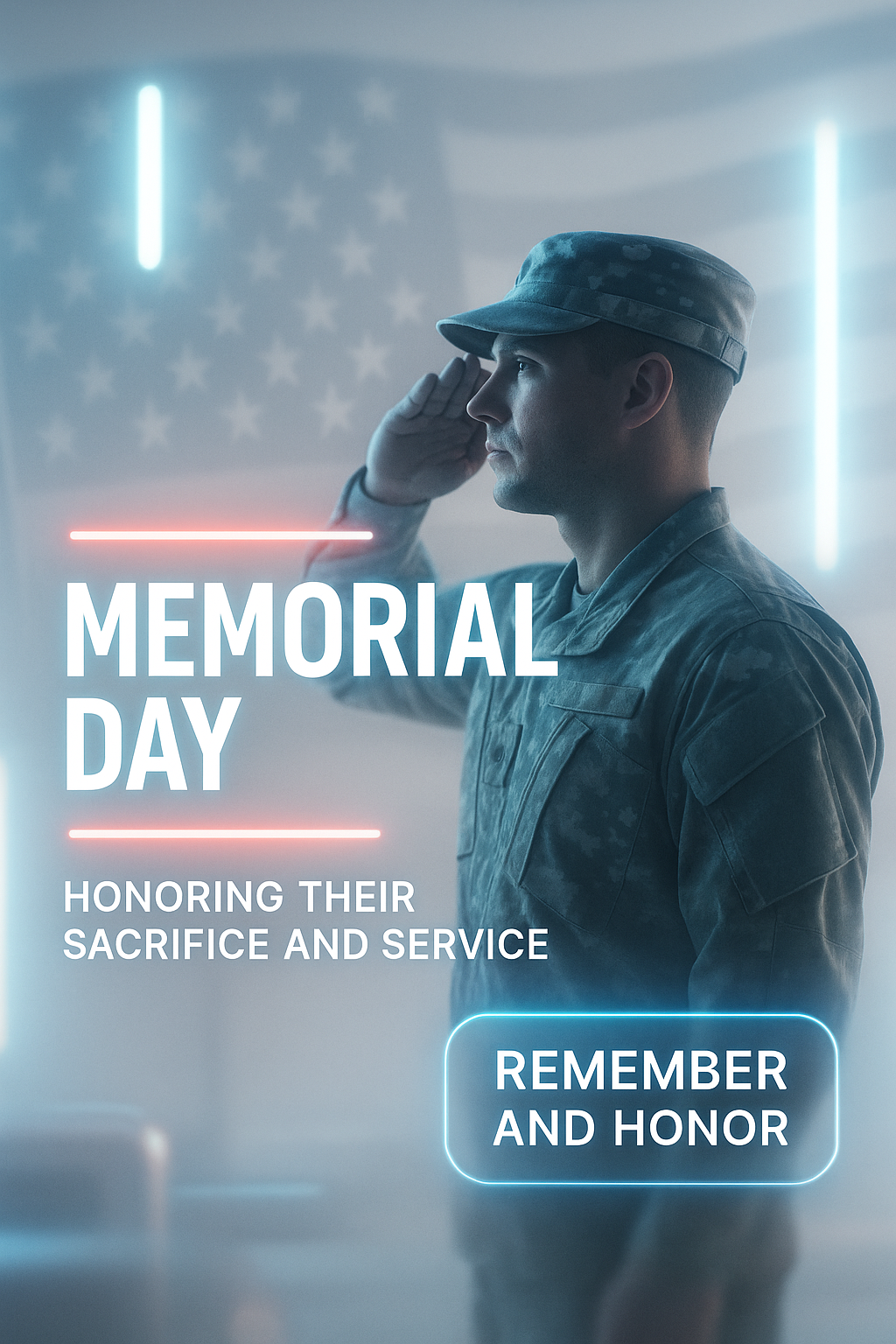 /Collection: /by davooda/Type: PNG/A poignant Memorial Day graphic featuring a soldier saluting, designed to honor military service. The modern visual style incorporates patriotic elements, making it suitable for commemorative events or social media posts.