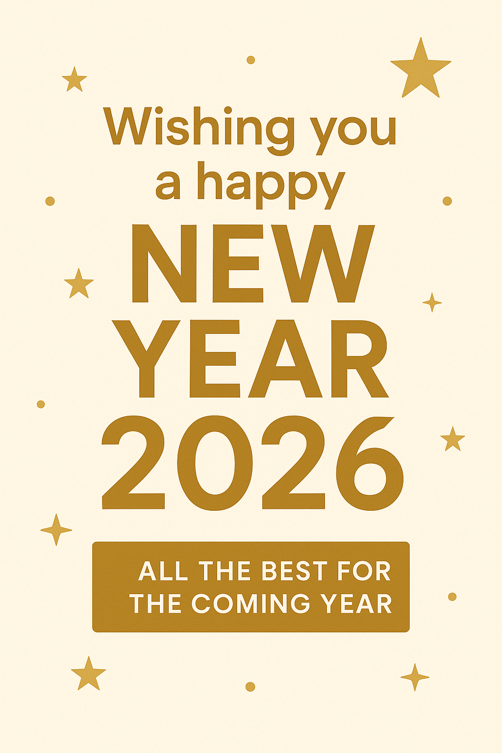 A festive greeting card design wishing a happy New Year 2026, featuring gold typography and star motifs, perfect for holiday celebrations and personal messages.