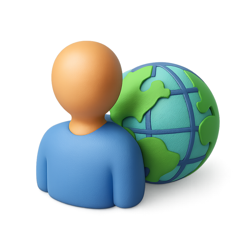 /Collection: /by davooda/Type: PNG/A stylized 3D icon featuring a simplified human figure beside a colorful globe. The figure has a smooth texture and a blue shirt, while the globe displays green continents on a blue ocean.