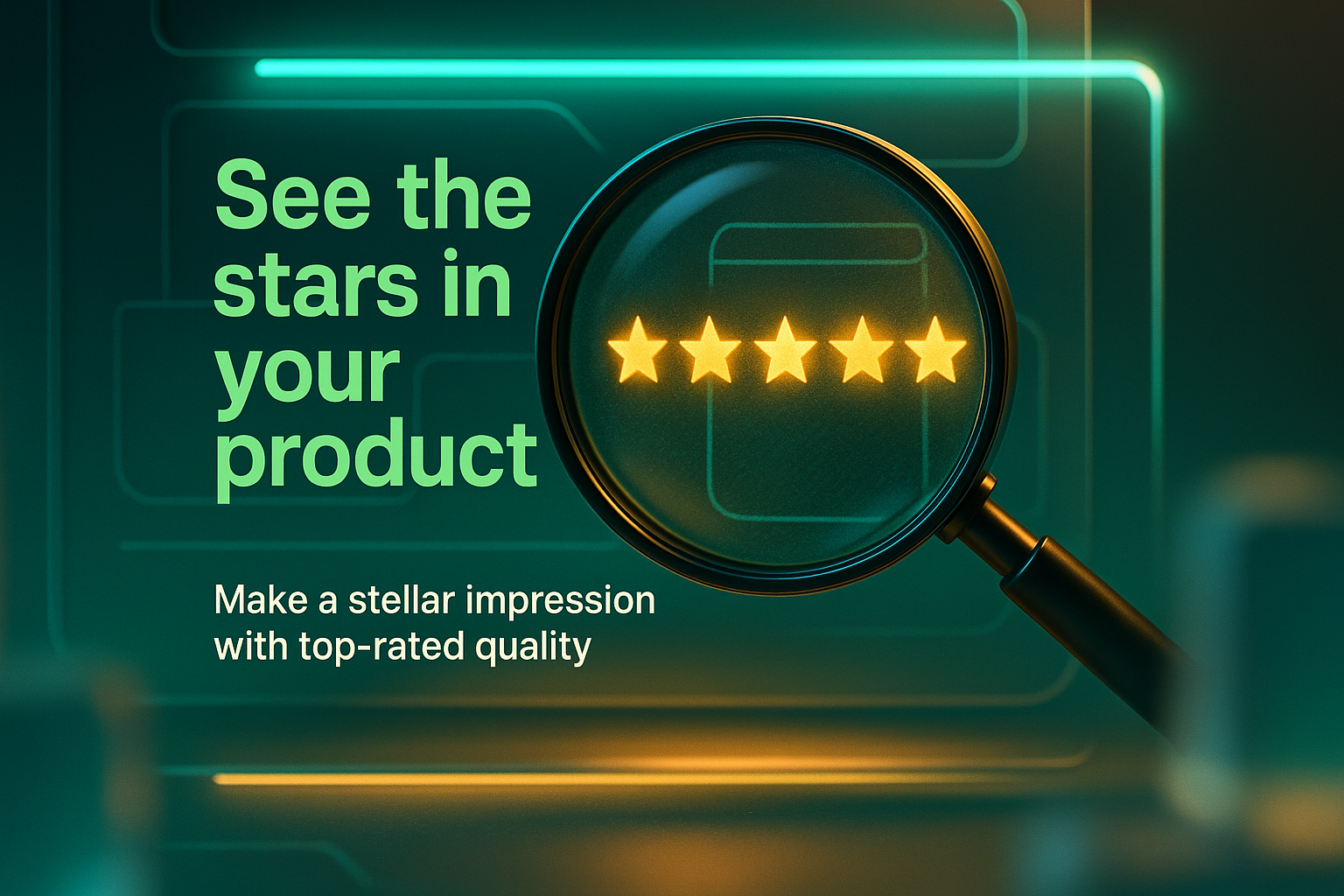 Digital Marketing Graphic Featuring Magnifying Glass and Star Ratings