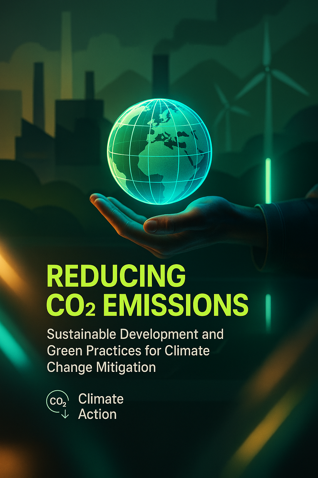 /Collection: /by davooda/Type: PNG/A visually striking digital illustration emphasizing climate action through reducing CO2 emissions, featuring a glowing globe held in a hand, perfect for environmental campaigns or educational materials.