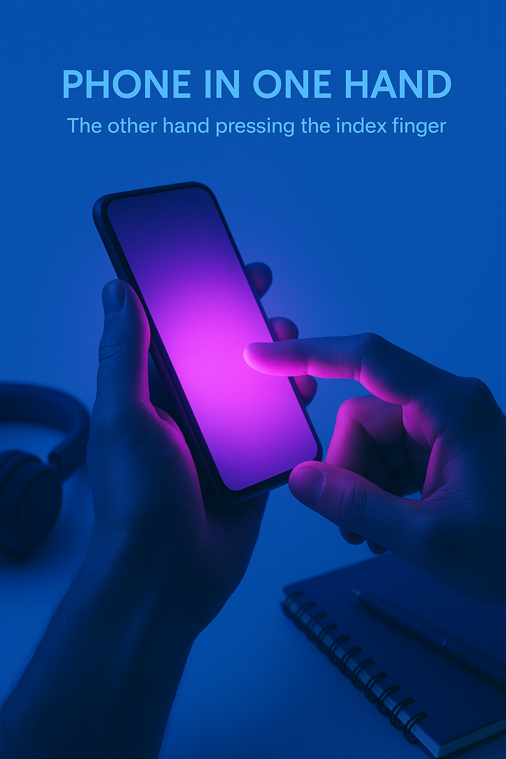 A hand holding a phone with a glowing neon-pink screen, while the index finger presses on it. The scene is illuminated in cool shades of blue and violet, creating a vibrant atmosphere.