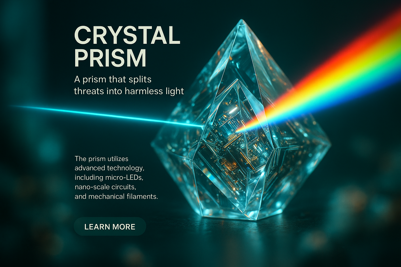 /Collection: /by davooda/Type: PNG/A stunning crystal prism captures light, splitting it into vibrant colors. The intricate design features glowing micro-LEDs and metallic components, surrounded by a soft, luminous haze.