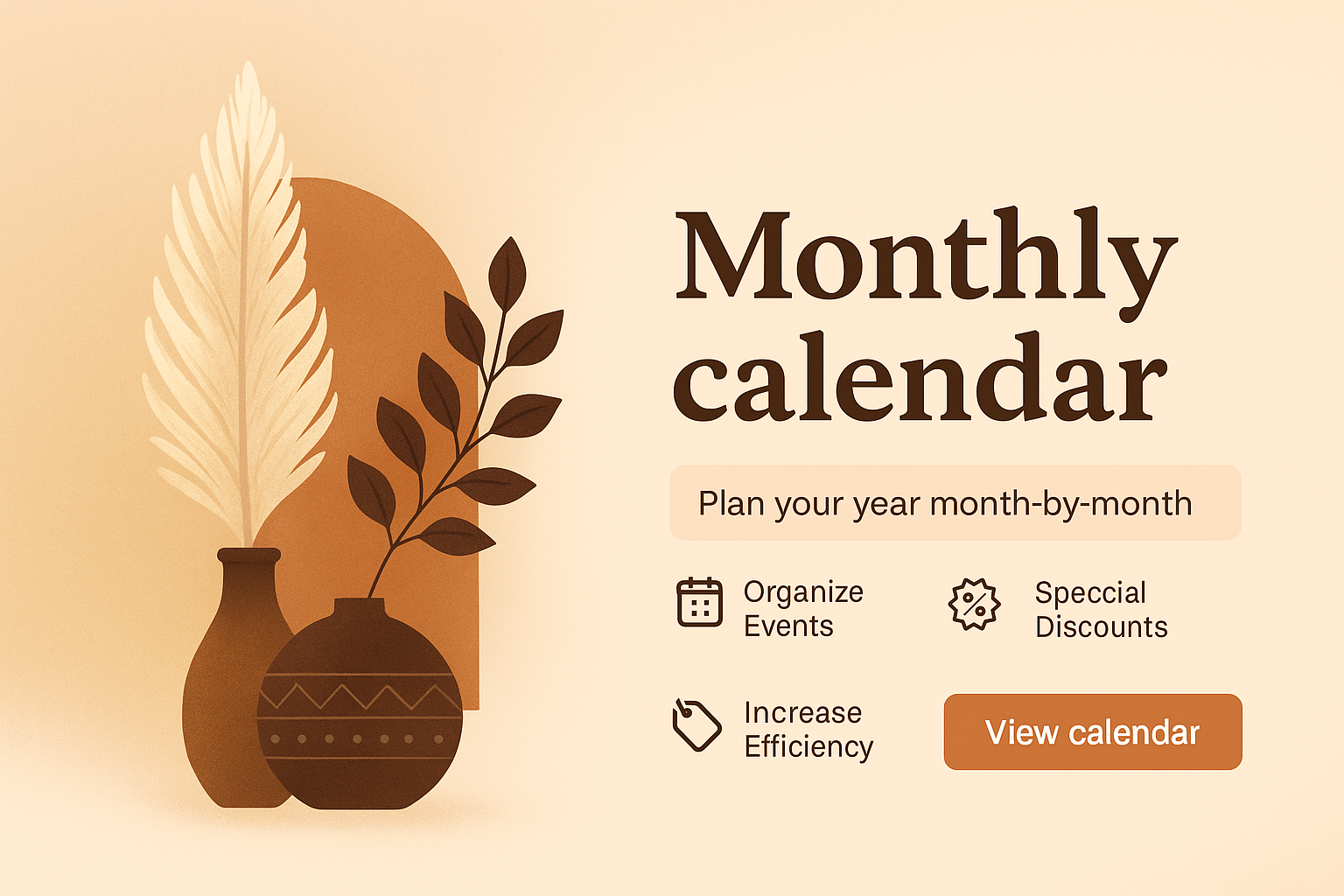 /Collection: /by davooda/Type: PNG/A beautifully designed monthly calendar slide in boho style featuring earthy tones, elegant typography, and decorative elements like vases and plants, inviting users to explore.