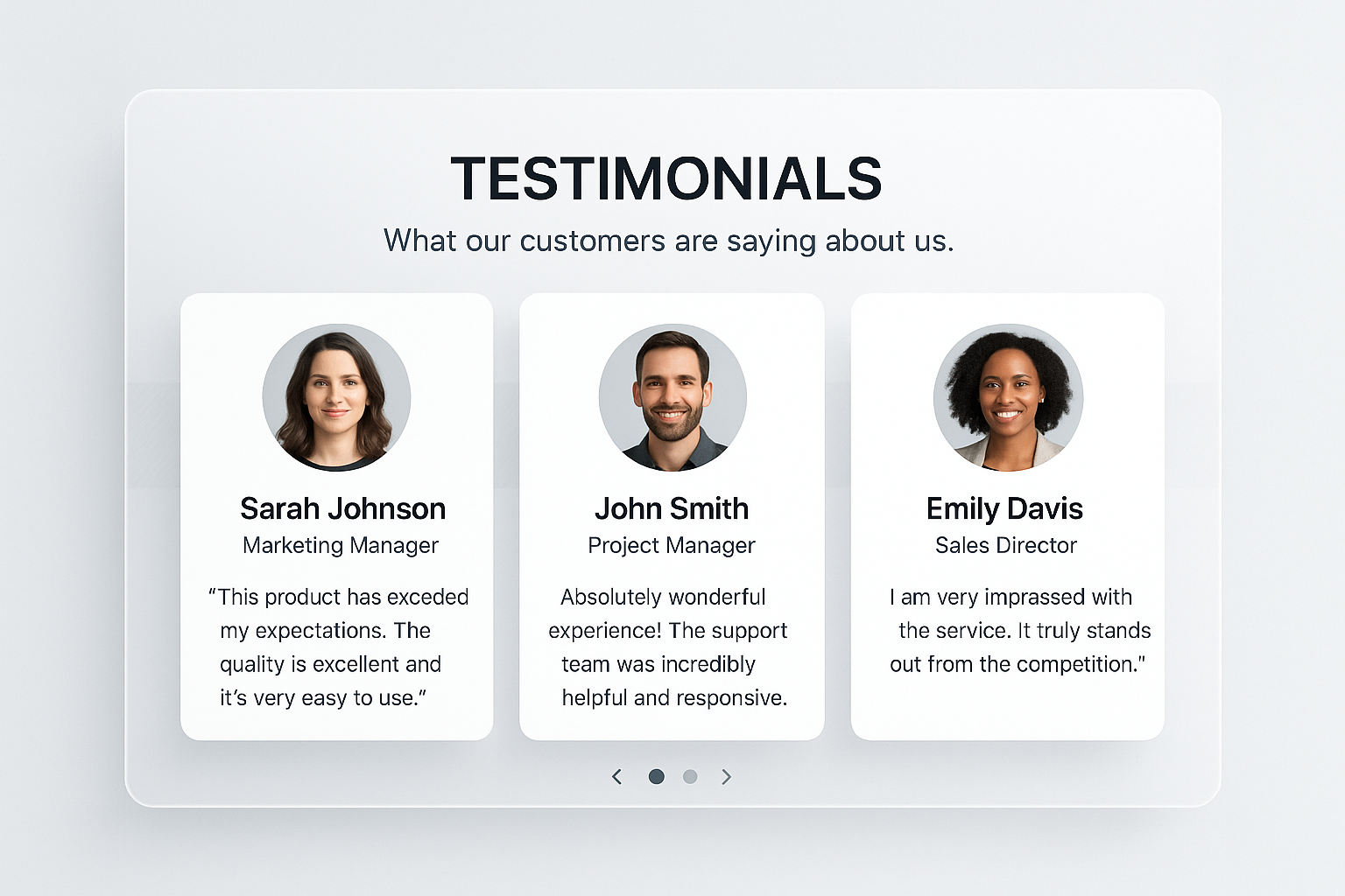 /Collection: /by davooda/Type: PNG/A testimonials section featuring three cards with circular author photos, names, positions, and personalized feedback. The design is clean and modern, showcasing customer satisfaction.
