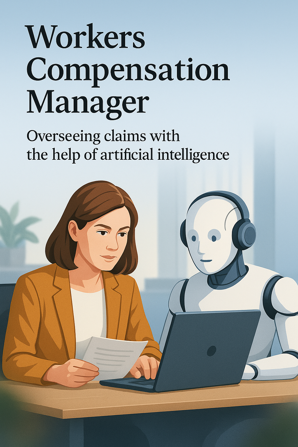 An illustration showing a Workers Compensation Manager and an AI assistant. The manager is reviewing claims documents while the AI, depicted as a humanoid robot, assists with technology.