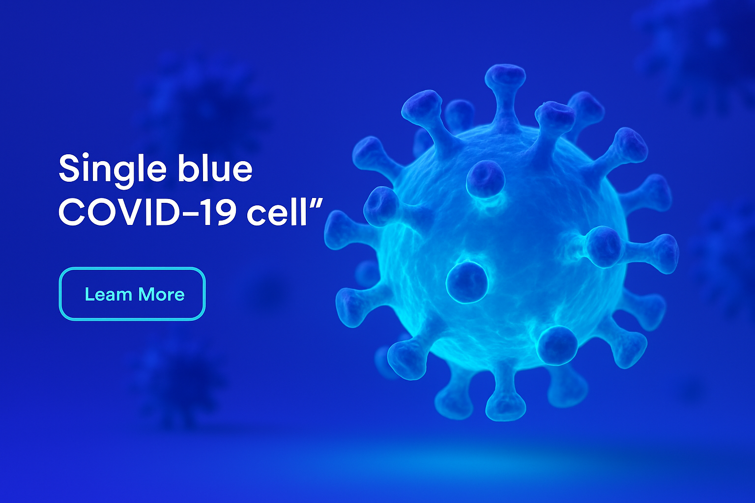 This 3D render showcases a single blue COVID-19 cell, illuminated with a neon aqua glow. The composition features a solid blue background, enhancing the fluorescent light effect.