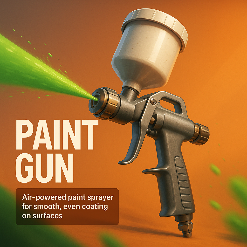Detailed 3D illustration of a paint gun with green paint being sprayed, showcasing its design and functionality. Ideal for tools advertising or DIY projects.