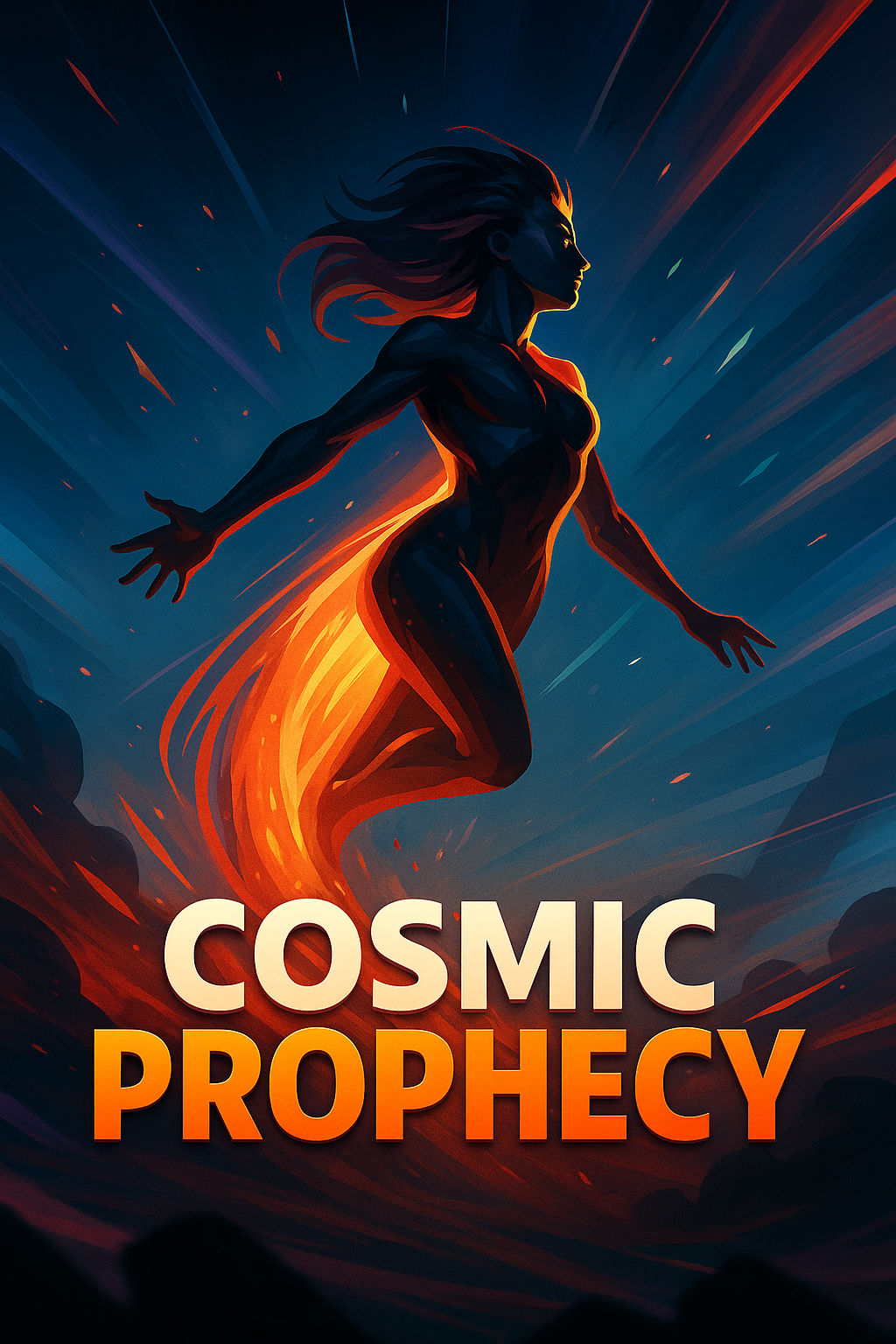 /Collection: /by davooda/Type: PNG/A vibrant illustration depicting a figure in motion, surrounded by dynamic lines and an energetic background. The title 'COSMIC PROPHECY' is prominently featured in bold, engaging colors.