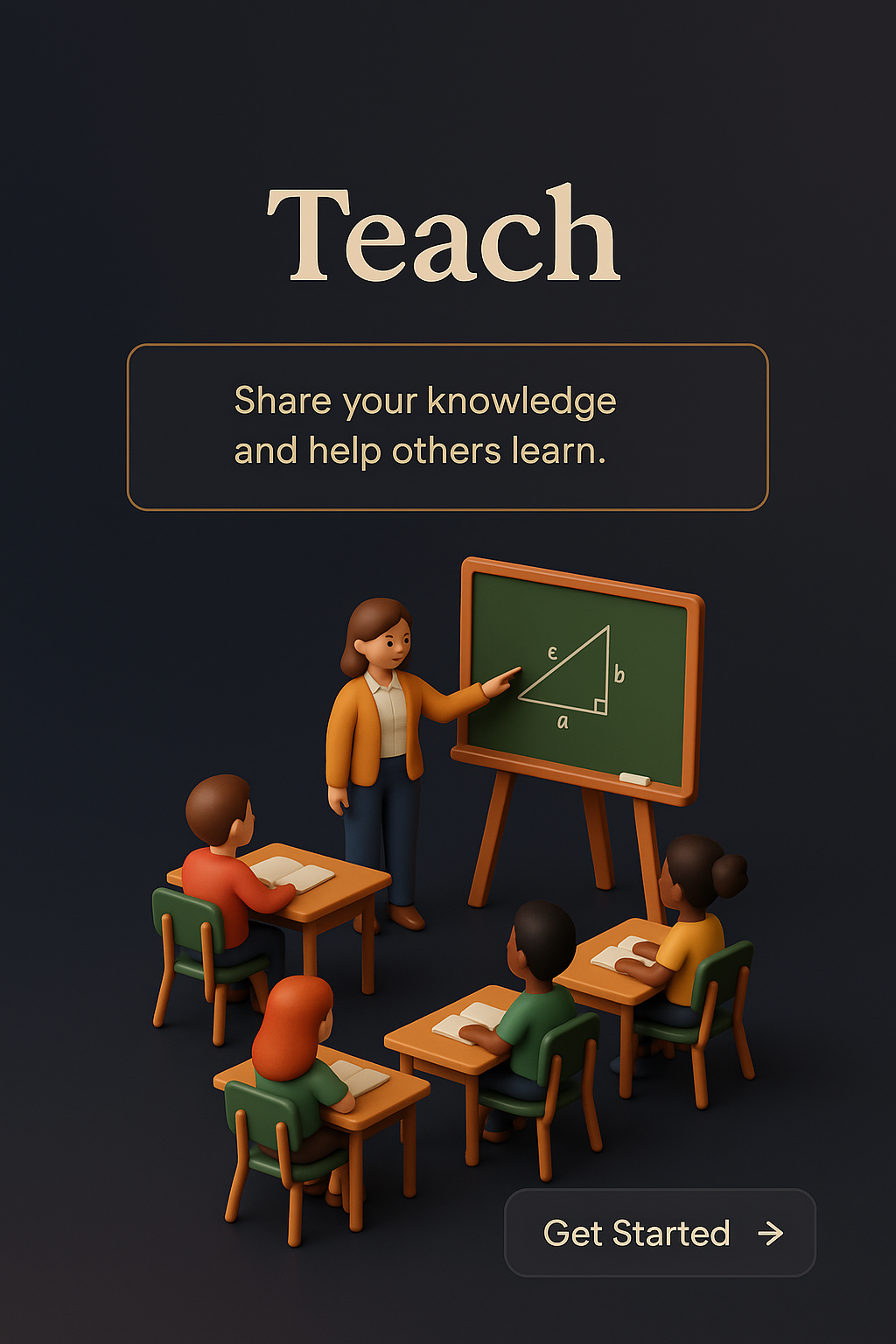 A detailed 3D representation of a classroom where a teacher is presenting to students. The scene is zoomed out, showcasing the environment in a visually appealing manner with a dark gradient background.