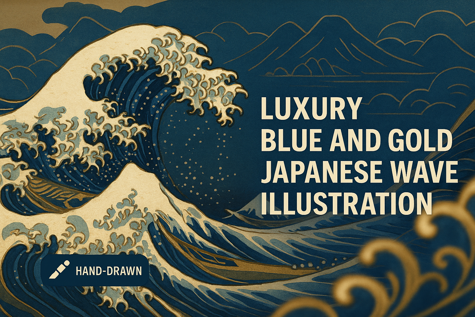 Luxury Hand-Drawn Japanese Wave Illustration in Blue and Gold