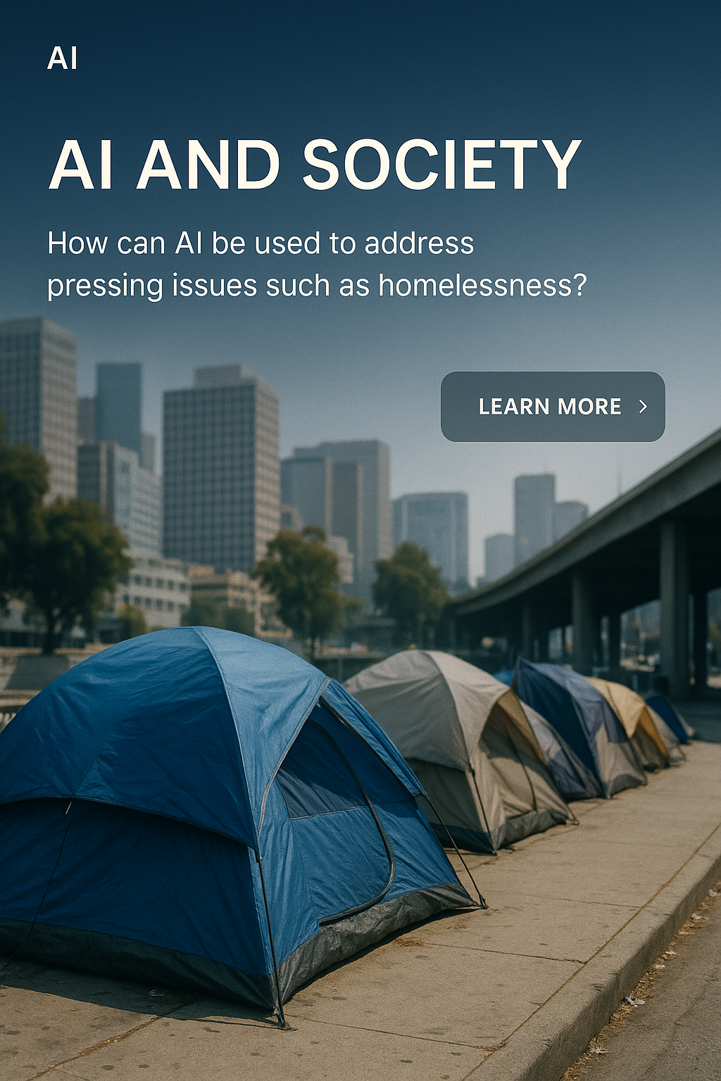 /Collection: /by davooda/Type: PNG/An illustration depicting a row of colorful tents set against a city skyline, highlighting the issue of homelessness and the potential role of AI in addressing it.