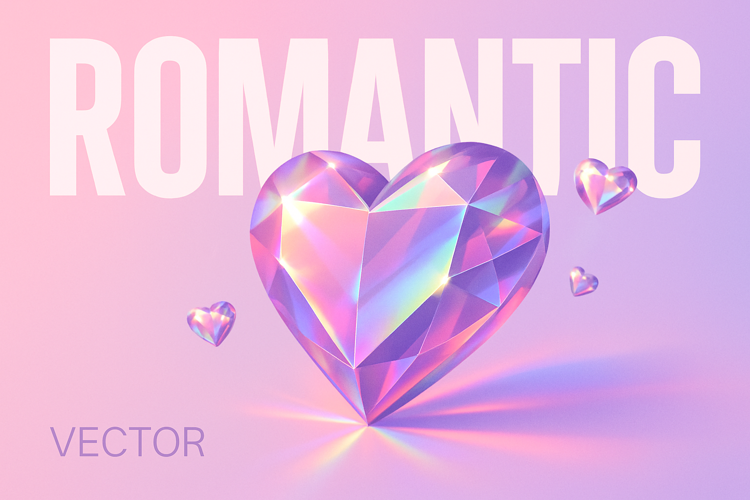 A hyper-realistic illustration of a crystal heart surrounded by smaller hearts, with a pink light prism effect. The bold typography reads 'ROMANTIC' in a modern style, set against a smooth gradient background.
