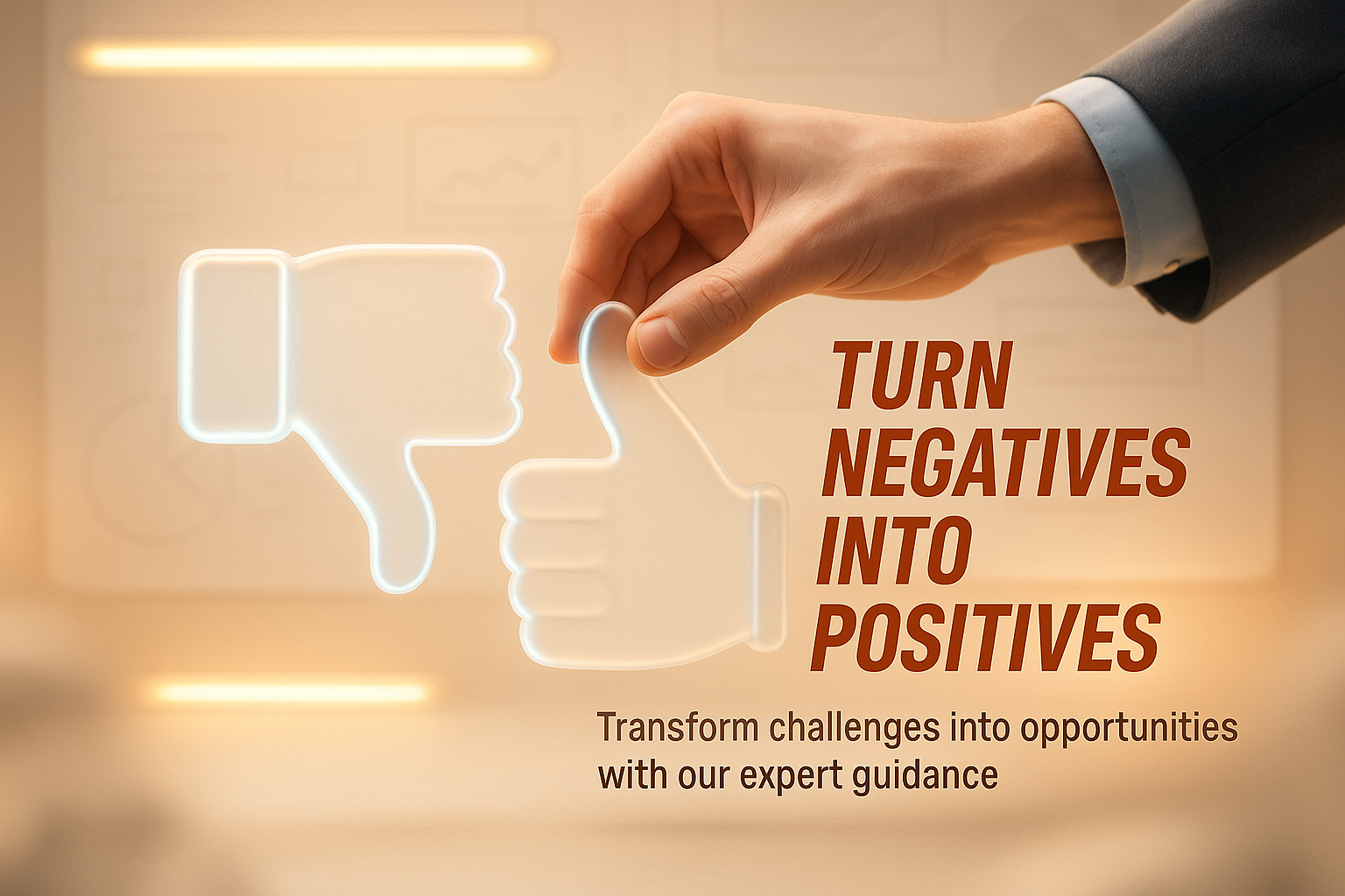/Collection: /by davooda/Type: PNG/A motivational graphic illustrating the concept of turning negatives into positives, featuring a hand interacting with thumbs up and down symbols. Ideal for coaching or self-help contexts.