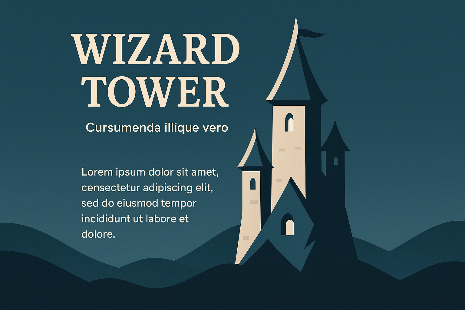 /Collection: /by davooda/Type: PNG/A beautifully designed wizard tower featuring a geometric structure, layered with a simple gradient background. The text is clear and engaging, enhancing the magical theme.