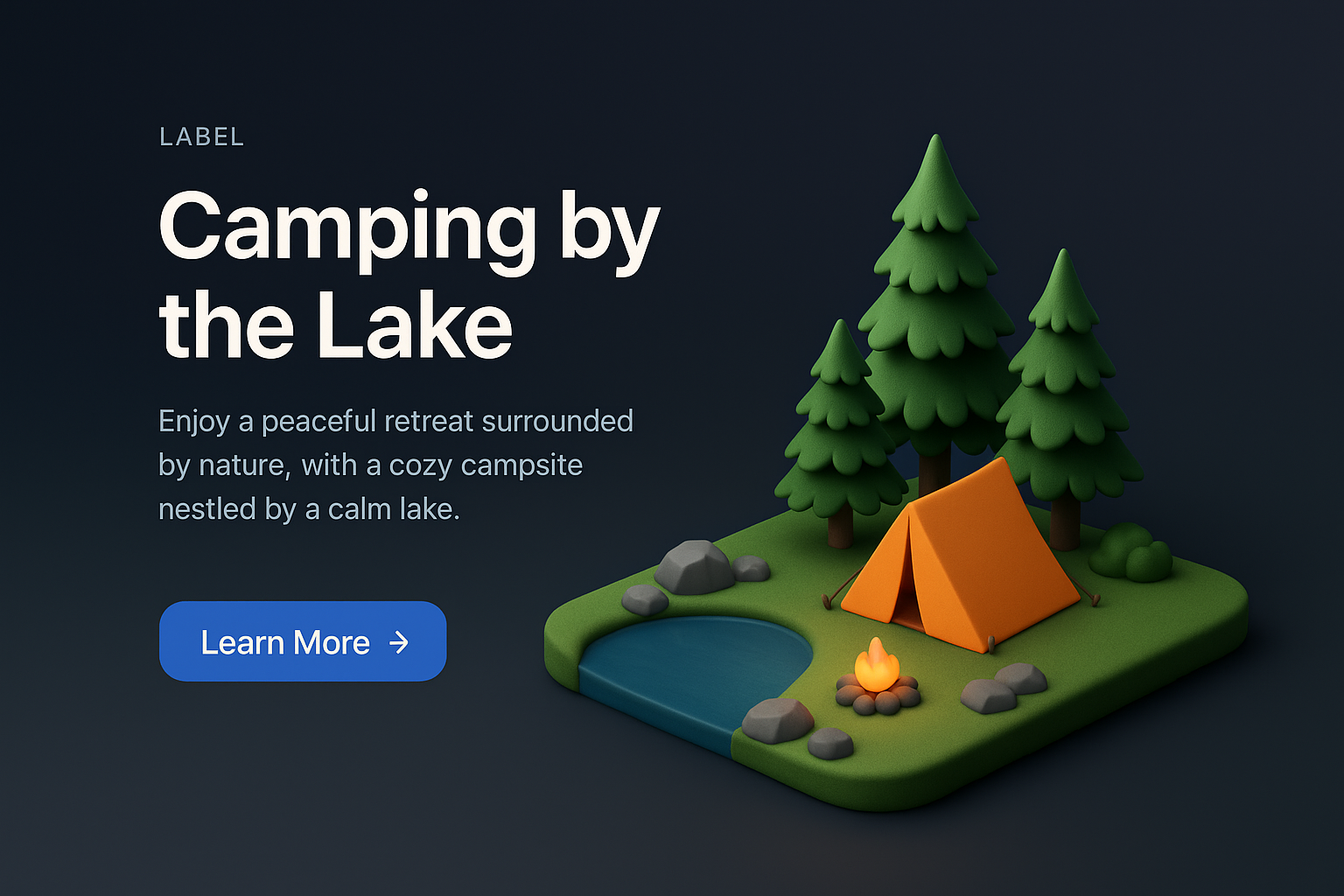 A 3D illustration depicting a small campsite by a tranquil lake, surrounded by trees. An orange tent and a campfire are featured prominently, creating a serene outdoor atmosphere.