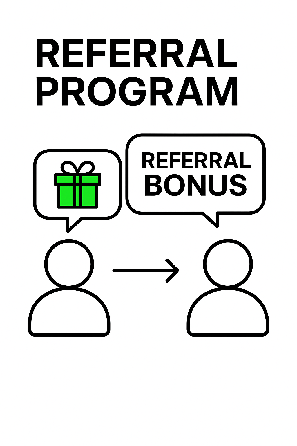 Minimalist promotional graphic illustrating a referral program concept, featuring simple iconography and bold typography, ideal for marketing materials.