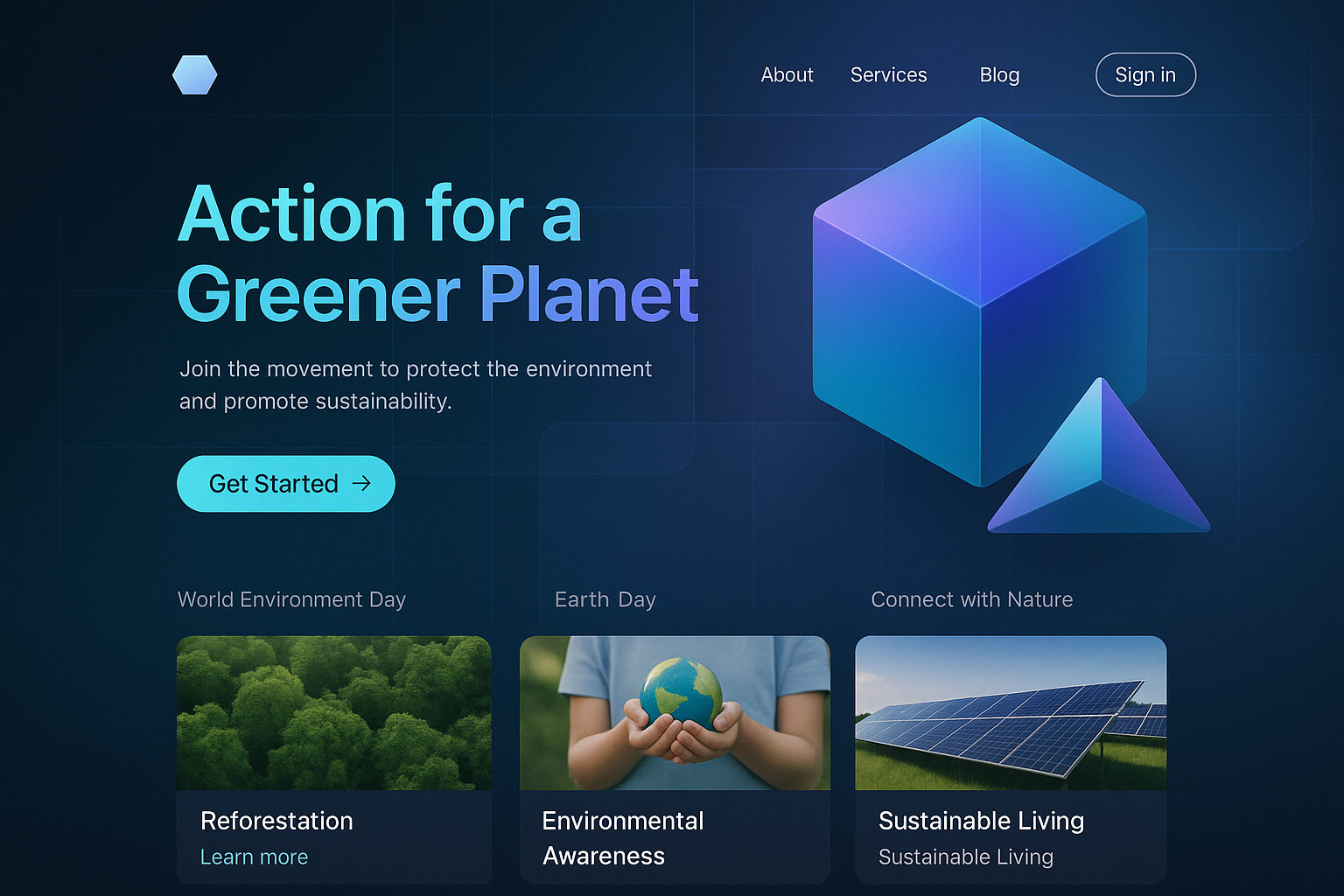 /Collection: /by davooda/Type: PNG/A modern landing page design featuring geometric shapes, a gradient background, and sections for environmental awareness. It emphasizes sustainability with a clean aesthetic.