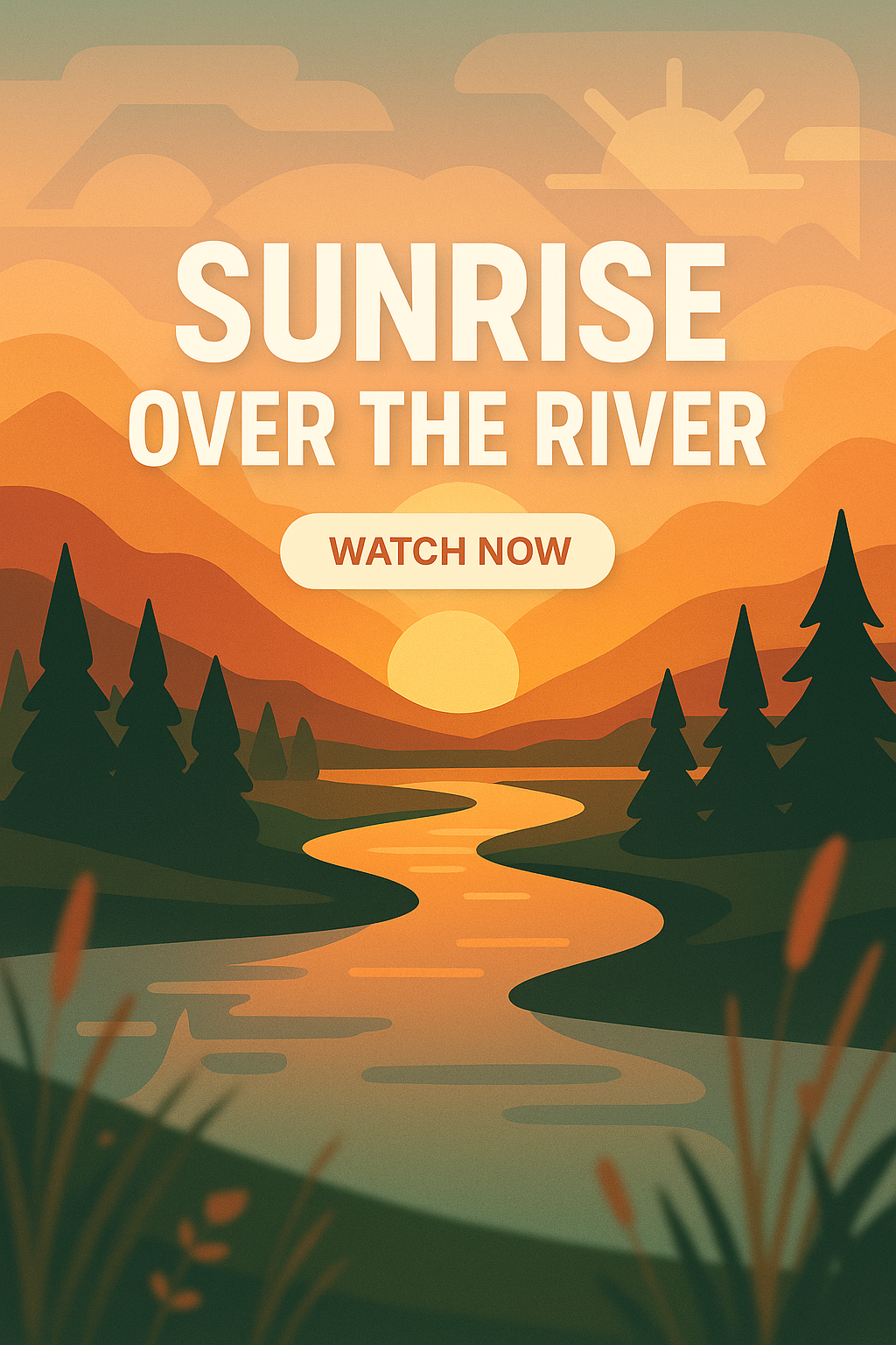 Stylized Landscape Artwork Featuring a Sunrise Over a River
