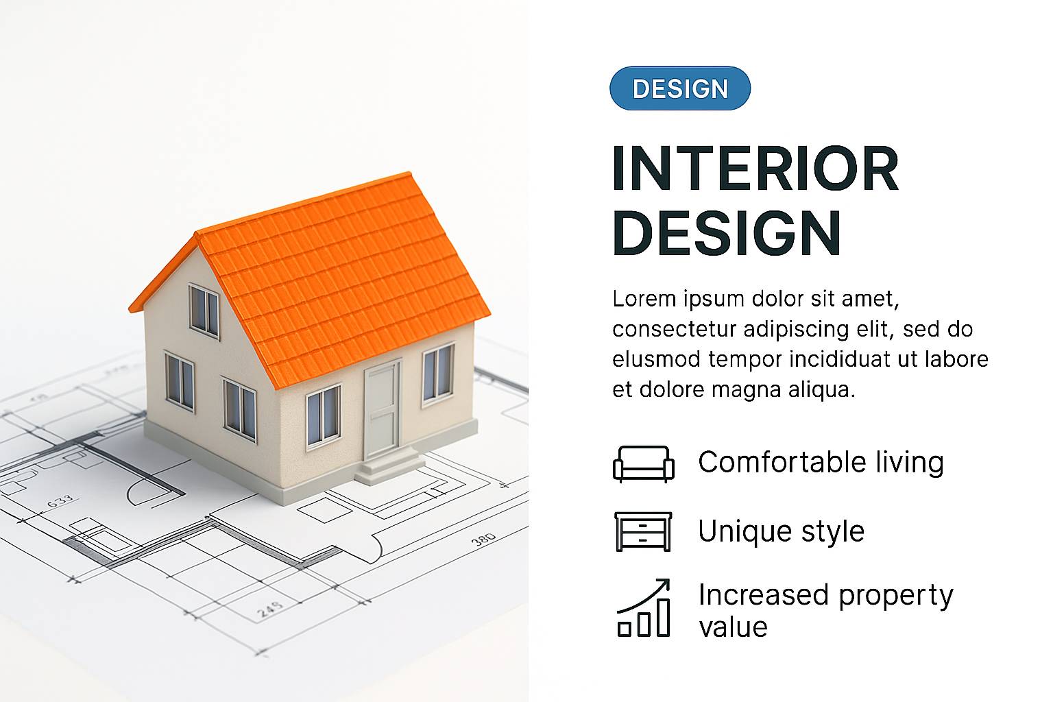 A 3D representation of a house placed on an architectural blueprint, combining elements of interior design and real estate. Ideal for presentations or marketing.