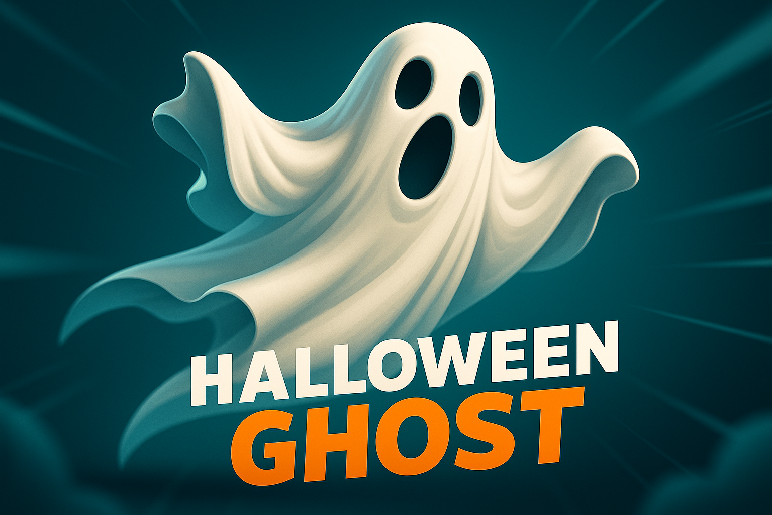 /Collection: /by davooda/Type: PNG/A vibrant Halloween ghost illustration featuring dynamic lines and bold text. The ghost appears lively against a smooth gradient background, enhancing its spooky charm.