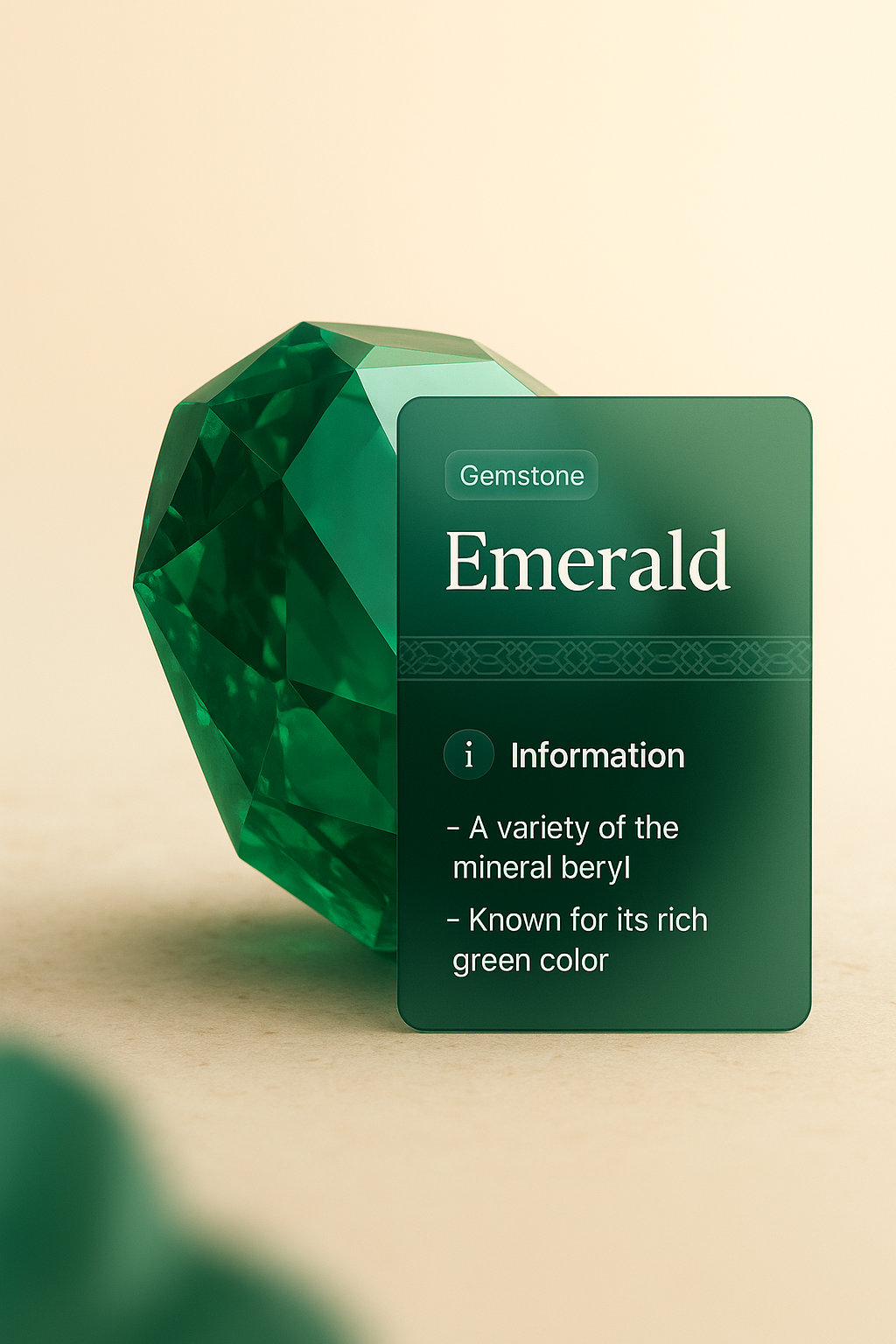 /Collection: /by davooda/Type: PNG/A visually appealing 3D illustration of an emerald gemstone accompanied by an informative card detailing its properties. The design combines a smooth gradient background with a rich green color scheme.