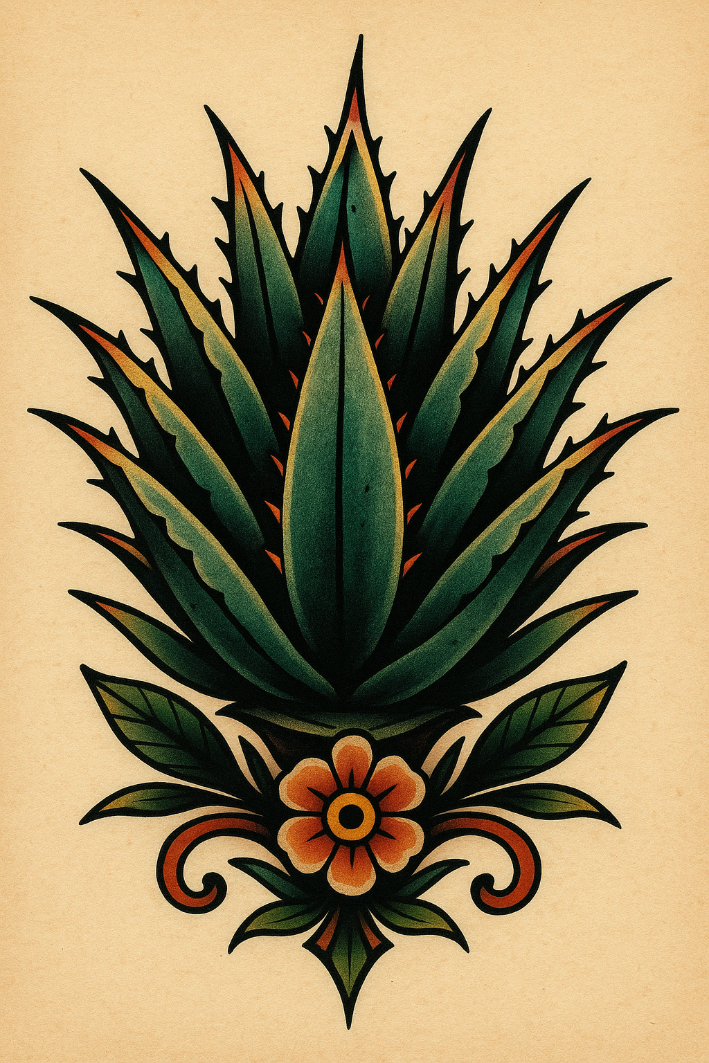 /Collection: /by davooda/Type: PNG/This image features a vibrant, traditional tattoo style illustration of an agave plant, characterized by bold colors and intricate details. Ideal for tattoo artists or design inspiration.