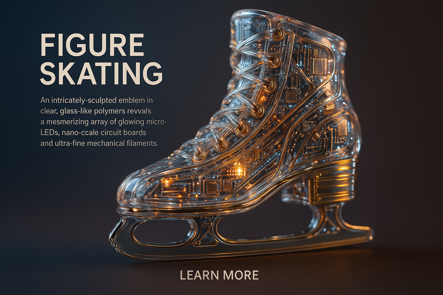 /Collection: /by davooda/Type: PNG/A hyperrealistic figure skating emblem made of clear polymers, showcasing glowing micro-LEDs and intricate mechanical details. The design features a gradient background and stylish soft lighting.