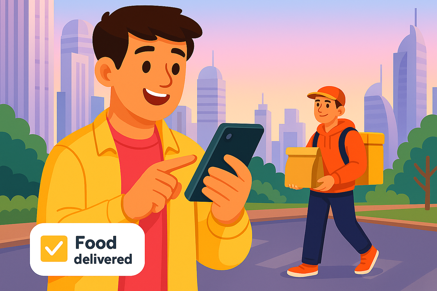 Vibrant digital illustration depicting a food delivery scenario with a happy customer and a delivery person in a city park, ideal for food service promotions.