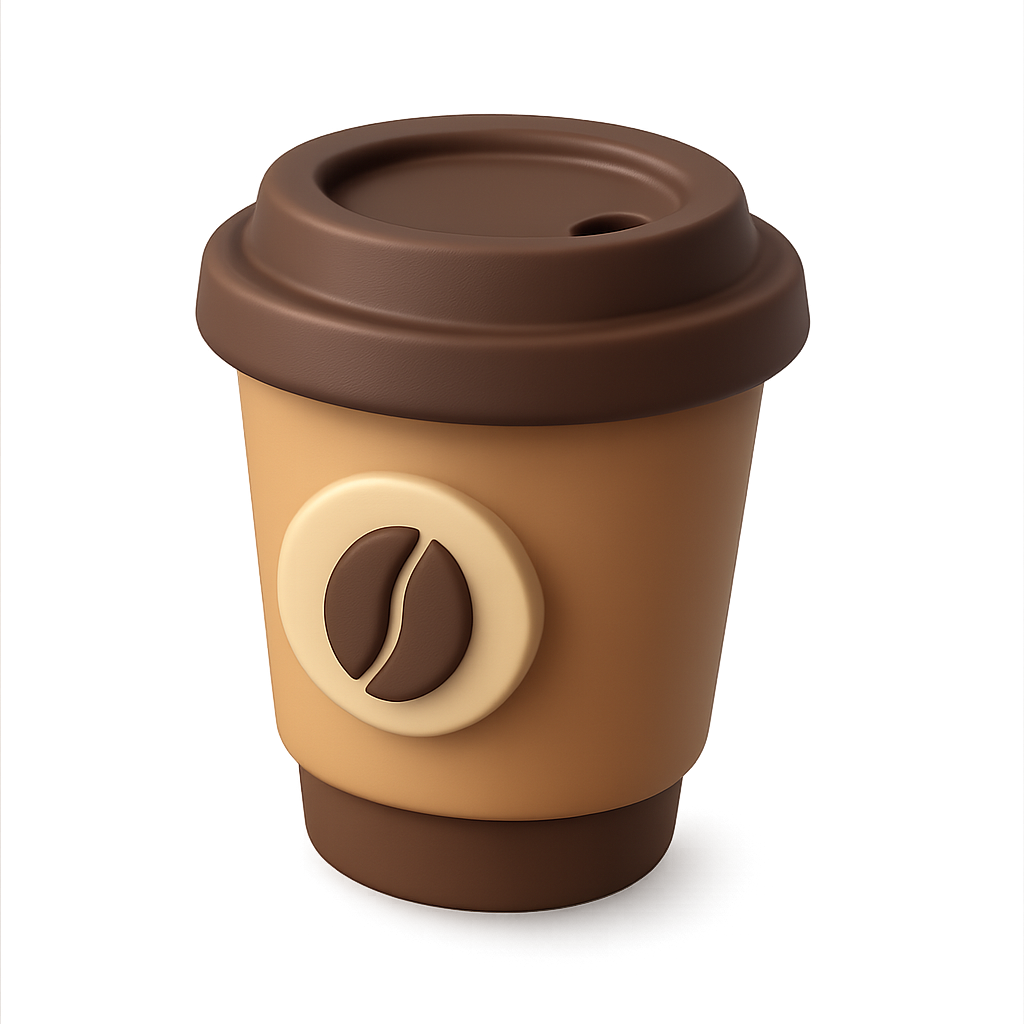 A visually appealing 3D coffee cup icon designed with a three-quarter view. The cup features a brown lid, a beige body, and a coffee bean emblem, all rendered with a smooth and volumetric finish.