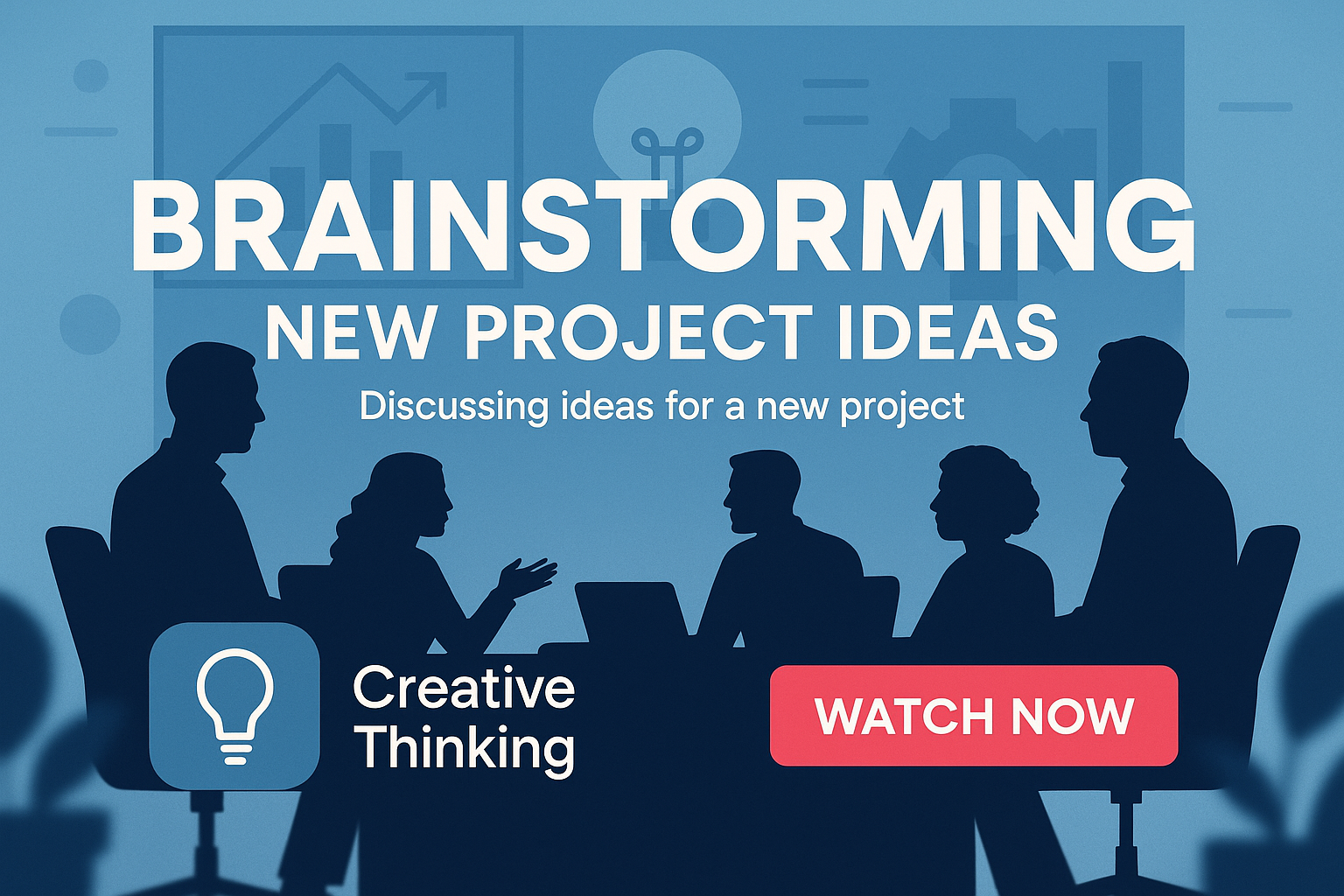 Promotional graphic showcasing a brainstorming session with silhouettes of people discussing project ideas, designed for engaging content marketing and creative workshops.