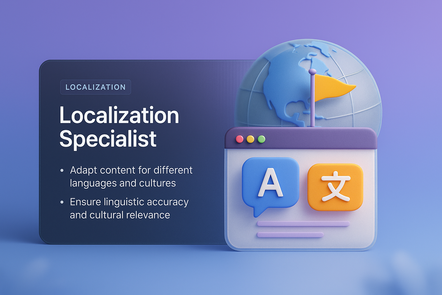 /Collection: /by davooda/Type: PNG/A vibrant 3D illustration showcasing a web page for a Localization Specialist. Features a globe, flags, and multilingual text icons, set against a smooth gradient background.