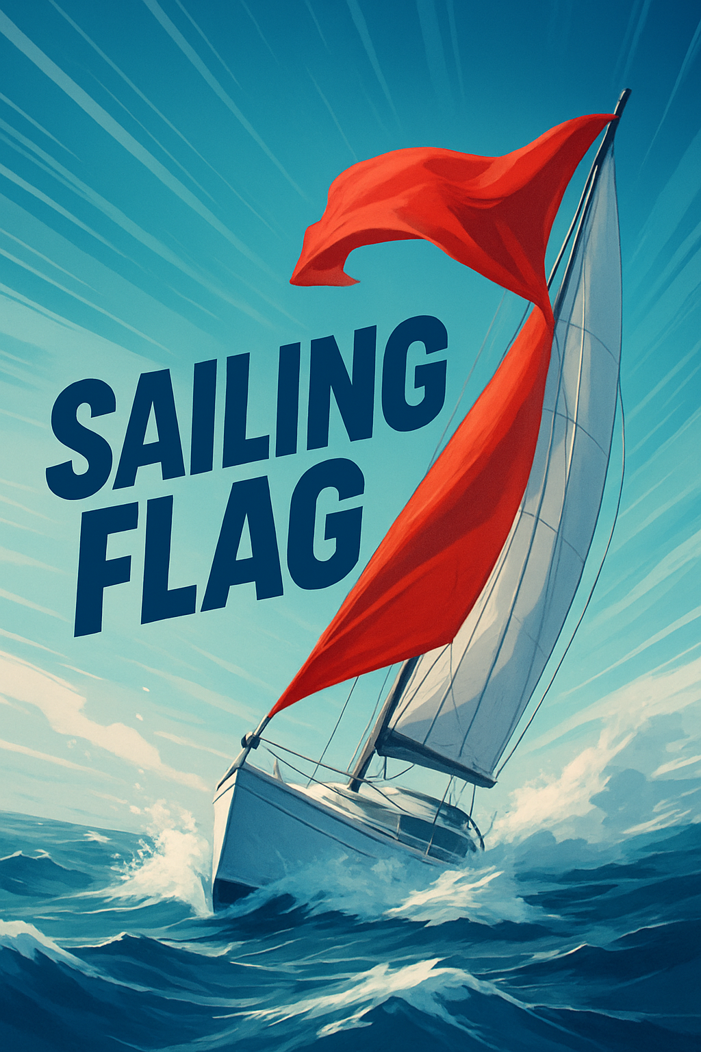 A vibrant illustration featuring a sailing boat with a striking red flag billowing in the wind, set against a dynamic blue sky and ocean backdrop.