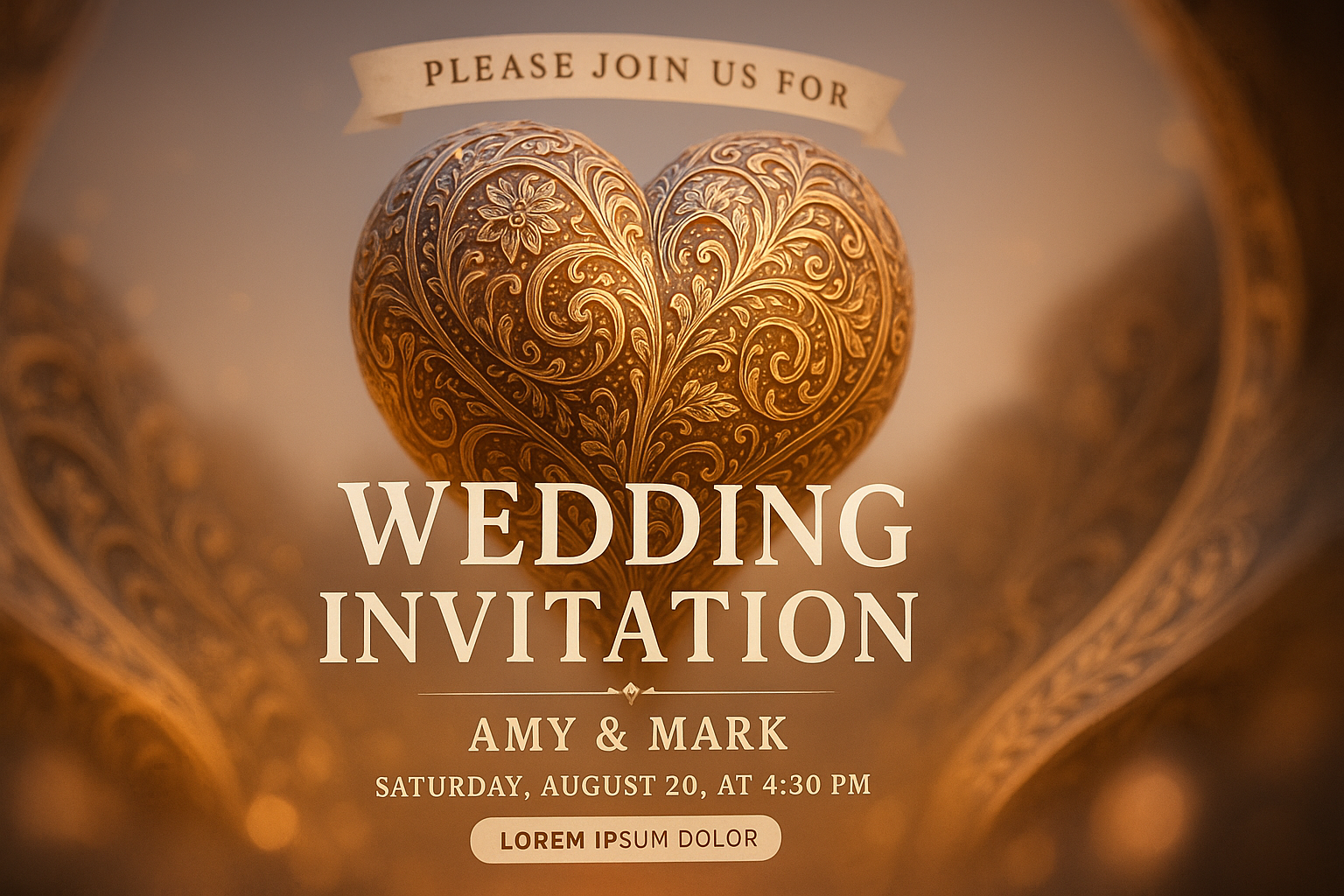 /Collection: /by davooda/Type: PNG/A beautifully designed wedding invitation featuring an ornate heart motif, perfect for elegant events. The warm color palette and sophisticated typography enhance the romantic theme.