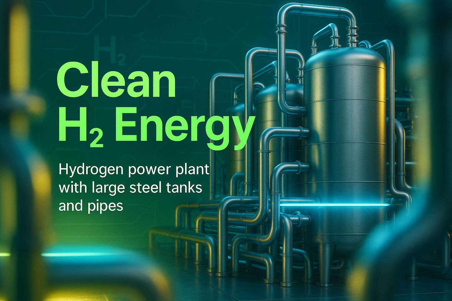 /Collection: /by davooda/Type: PNG/A modern digital illustration representing a hydrogen power plant, featuring large steel tanks and pipes. This image is ideal for energy sector presentations or educational materials focused on clean energy solutions.